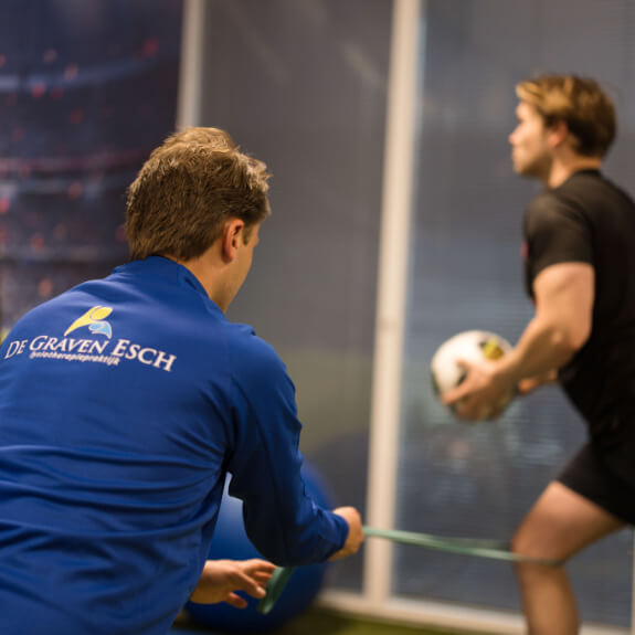 "Voor snelle en veilige terugkeer in de sport maakt de sportfysiotherapeut een analyse van de sport(er) en van de klachten. De revalidatie van een blessure kan zijn op basis van acute blessures zoals een enkelverzwikking of zweepslag, chronische klachten als een achillespeesblessure/tenniselleboog of postoperatieve revalidatie zoals een kruisbandreconstructie (VKB)"